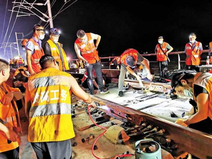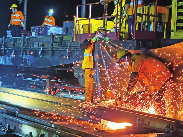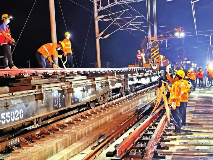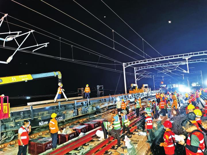 21时50分,施工现场机器轰鸣,4盏大灯从不同方向缓缓亮起,作业人员迅速就位,拆卸连接杆件和扣件、进行钢轨切割作业……工地上瞬间热闹起来。